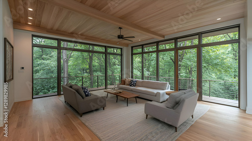 Modern Living Room with Large Windows and Treetop View