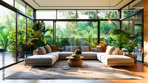 Modern living room with large windows, lush indoor plants, white sectional sofa, and surrounded by a serene forest view.