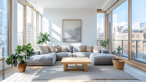 Modern Living Room With Large Windows Natural Light Grey Sofa Wooden Coffee Table Minimalist Decor Indoor Plants