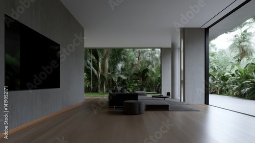 modern, living, room, interior, design, contemporary, luxury, roomy, minimalist, tropical, garden, view, window, concrete, wall, television, sofa, furniture, decor, home, house, apartment, architecture, style, lighting, plant, tree, nature, calm, peaceful, elegant, comfortable, wood, floor, open, space, relaxing, area, furnishing, stylish