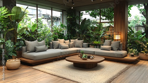 living, room, modern, sofa, plant, interior, design, decor, furniture, wood, hot drink, table, greenery, natural, light, cosy, home, comfortable, roomy, contemporary, relaxing, elegant, stylish, calm, peaceful, minimalist, texture, organic, lush, foliage, house, wooden, chair, rug, accent, luxurious