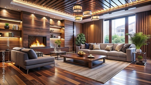 Modern living room with rich wooden accents, sleek lines, and warm lighting, showcasing perfect blend of comfort and contemporary wood design elements.