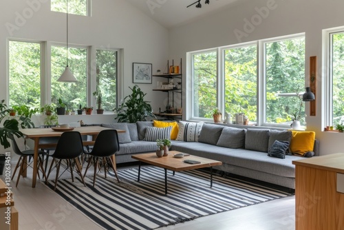 room, living, modern, interior, home, design, decor, house, sofa, sectional, grey, table, dining, window, large, green, plant, rug, striped, light, bright, wood, floor, furniture, cosy, comfortable, stylish, minimal, clean, space, open, area, natural, sunlight, view, landscape, contemporary, aesthetic, style, apartment, bungalow, cabin