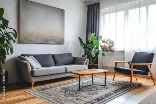 interior, living, room, modern, sofa, armchair, plant, rug, design, home, decor, apartment, house, style, furniture, contemporary, minimalist, cosy, comfortable, light, bright, window, curtain, wood, floor, grey, beige, natural, aesthetic, space, relaxing, calm, simple, elegant, stylish, ambience, comfort, serene, warmth