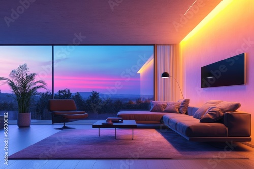 home decor, interior design, furniture, sofa, armchair, coffee table, rug, lamp, television, sunset, sky, landscape, tree, house, home, apartment, relax, comfort, night time, evening, relaxation, home improvement