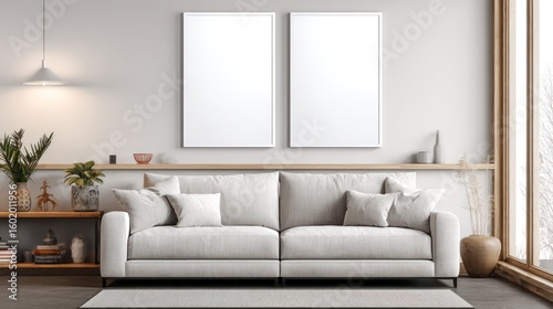 living, room, modern, interior, decor, sofa, white, canvas, frame, empty, light, beige, wood, shelf, plant, rug, cosy, minimalist, scandinavian, design, contemporary, neutral, clean, bright, roomy, window, view, warm, natural, blank, artwork, display, home, furniture, soft, calm, simple, stylish, image, three-dimensional, rendering