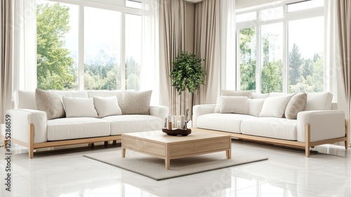 sofa, white, modern, living, room, light, natural, bright, airy, roomy, window, large, curtain, beige, neutral, minimalist, contemporary, elegant, clean, simple, wood, wooden, floor, marble, rug, carpet, cushion, pillow, plant, green, tree, cosy, comfortable, relaxed, serene, calm, home, interior, design, style, decor, furniture, hot drink, table
