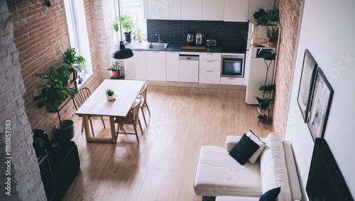 apartment, interior, design, modern, loft, kitchen, living, room, open, plan, space, cosy, seating, area, home, decor, style, furniture, wood, floor, brick, wall, plant, table, chair, sofa, pillow, window, light, bright, minimal, chic, aesthetic, elegant, contemporary, stylish, house, flat, building