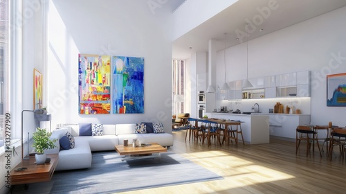 apartment, loft, living, room, kitchen, sunlight, modern, interior, design, home, house, white, roomy, open, plan, furniture, contemporary, chic, style, luxury, bright, airy, clean, minimalist, elegant, comfortable, relaxing, sophisticated, calm, peaceful, serene, inviting, cosy, warm, window, floor, wood, art, decor, wall, view, city, urban