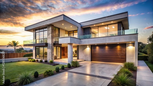Modern Luxurious Home Exterior at Sunset, modern architecture