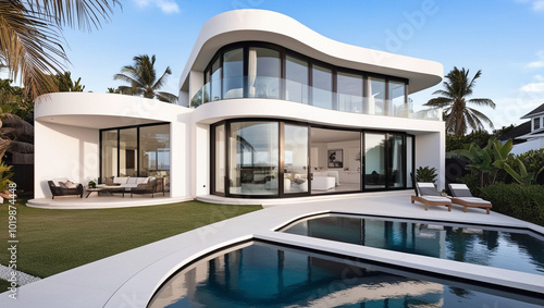modern, luxury, beach, house, contemporary, architecture, glasses, window, tropical, surrounding, curved, angular, form, black, white, minimalist, coastal, living, high-end, design, geometric, line, sunlit, facades, balcony, railing, palm, tree, plant, property, sleek, upscale, neighbourhood, clean, stylish, residential, sophisticated, modernist, chic, roomy, oceanfront, exclusive, waterfront, exterior