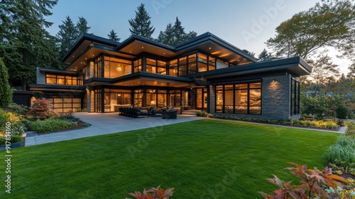 Modern luxury home exterior with large glass windows and manicured lawn