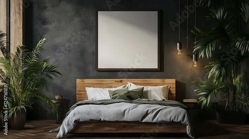 Modern Luxury Home Interior Bedroom Design with Mockup Frame , Wall, lamp, table, Poster(3d Render)