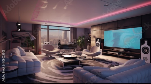 room, home, theatre, city, view, modern, luxury, design, evening, night, sophisticated, elegant, comfortable, seating, couch, cushion, pillow, floor, carpet, rug, table, hot drink, entertainment, system, speaker, audio, video, screen, television, large, display, technology, lighting, pink, dim, ambient, sleek, stylish, contemporary, architecture, window, panoramic, skyscraper, mountain, plant, decor, minimalist