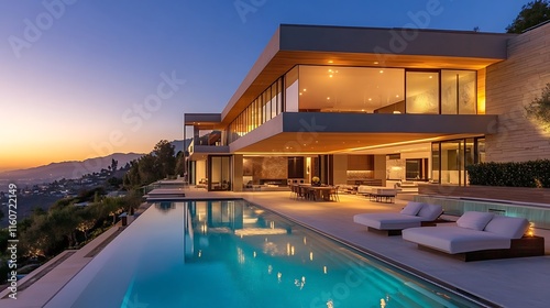 house, home, villa, modern, luxury, architecture, building, design, real estate, property, estate, sunset, evening, night, twilight, dusk, sky, mountain, city, view, landscape, panorama, pool, forever, water, blue, exterior, residential, contemporary, elegant, roomy, comfortable, lifestyle, tranquil, serene, relaxing, dream, aspiration, wealth, success, opulence, affluent, beautiful, stunning, impressive