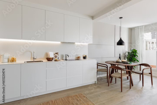 Modern luxury kitchen interior in minimal scandinavian style, 3d render