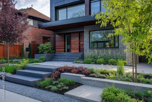 modern, house, home, exterior, architecture, residential, luxury, contemporary, landscaping, facades, design, building, garden, step, paseo, property, real estate, stylish, sleek, high-end, upscale, development, construction, urban, modernism, minimalist, shrubbery, tree, plant, yard, grey, wood
