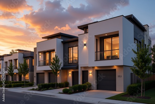 Modern Luxury Townhouses at Sunset Contemporary Architecture Evening Exterior