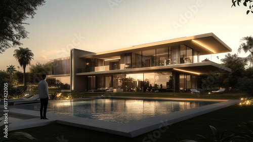 modern architecture, swimming pool, sunset, poolside, backyard, lawn, landscaping, patio, garden, tropical, minimalist, luxury home, real estate, property, house, building, residence, architecture, design, home, luxury, modern, villa, pool