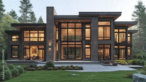 Modern mansion illuminated at dusk, nestled in forest