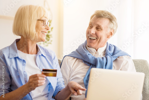 Modern mature couple shopping online on laptop, using credit card when choosing new clothes