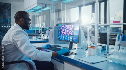 Modern Medical Laboratory: Male Scientist, Typing on Keyboard working on Computer, Scren Shows DNA Research Concept. Advanced Scientific Lab, Medicine Biotechnology Development.