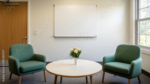 Modern meeting room with green armchairs, round table, whiteboard and flowers