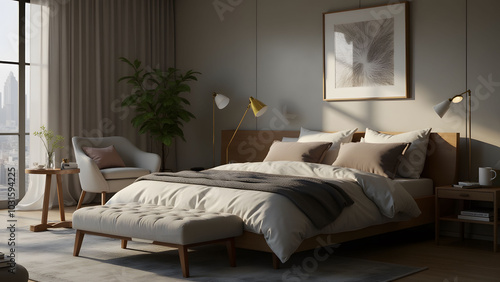 Modern Minimalist Bedroom Interior Design with Wooden Furniture and City View