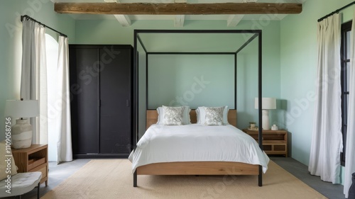 Modern Minimalist Bedroom with Canopy Bed and Light Green Walls. Stylish bedroom featuring a canopy bed, contemporary decor, and soothing light green walls. Perfect for interior design inspi...