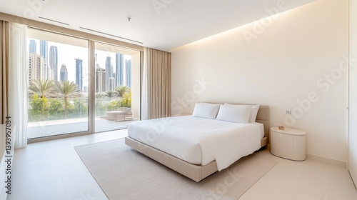 Modern, minimalist bedroom with city views. Spacious and bright interior with neutral color palette. Large windows provide a stunning outlook on the cityscape and greenery