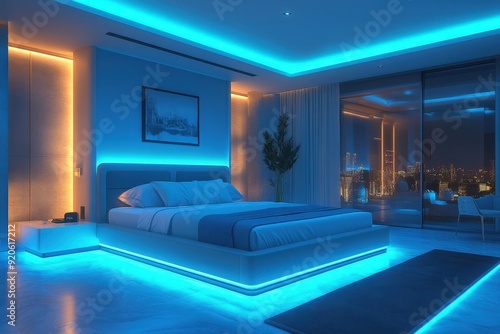 Modern Minimalist Bedroom with Neon Blue Ambient Lighting and Stunning Cityscape View