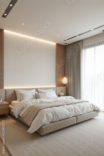 modern, minimalist, bedchamber, neutral, cosy, elegant, contemporary, stylish, serene, peaceful, interior design, warm, luxury, simplicity, beige, white, sleek, comfortable, sophisticated, refined, tranquil, relaxing, bed, pillow, curtain, natural light, upscale, home decor, aesthetic, chic, restful, harmony, scandinavian, uncluttered, airy, calm, roomy, inviting, urban living