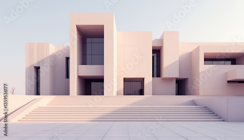 building, minimalist, modern, step, window, large, architecture, design, structure, clean, line, light, pastel, pink, white, sky, empty, open, space, stair, entrance, flat, roof, square, shape, geometric, simple, quiet, serene, calm, smooth, surface, evacuated, depth, shadow, bright