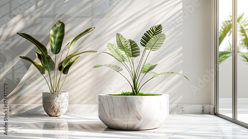 Modern Minimalist Home Interior with Large Green Indoor Plants in Planters on Marble Floor by Sunlit Window with Tropical Garden View 3d Rendering