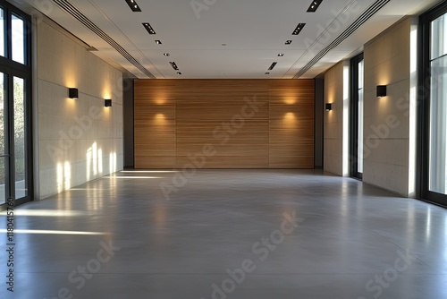 modern, minimalist, interior, design, wooden, wall, concrete, floor, light, ceiling, sleek, stylish, contemporary, roomy, bright, clean, polished, smooth, empty, room, hall, hallway, architecture, building, structure, line, texture, pattern, neutral, tone, beige, grey, brown, light, shadow, sun, window, glasses, frame, simple, elegant, ambience, atmosphere