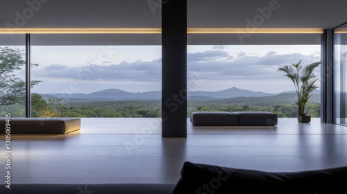 minimalist, interior, design, modern, architecture, mountain, view, twilight, roomy, furniture, large, window, serene, nature, lush, tree, contemporary, open, space, tranquil, relaxation, peaceful, cosy, aesthetic, luxury, lifestyle, evening, ambience, light, landscape, stylish, seating, area, natural, home, decor, sprawling, indoor, outdoors, harmony, green, sleek, rich, colours, living, zen
