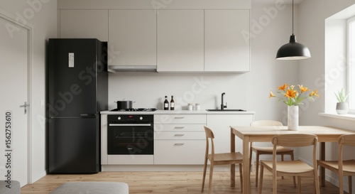 Modern Minimalist Kitchen with White Cabinets Black Refrigerator and Wooden Dining Table