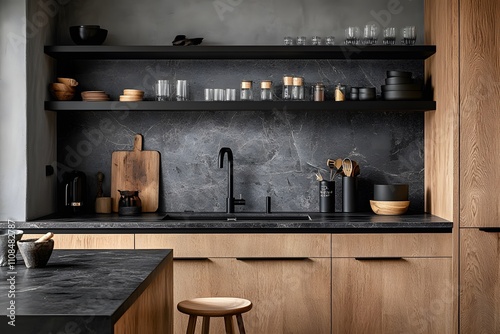 Modern Minimalist Kitchen with Wooden Shelves, Black and Wooden Utensils, and Elegant Decor Featuring a Marble Countertop and Stylish Accessories.