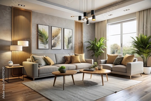 Modern Minimalist Living Room Interior Featuring Neutral Tones and Contemporary Abstract Art with a Cozy, Inviting Atmosphere for Stylish Urban Living Spaces