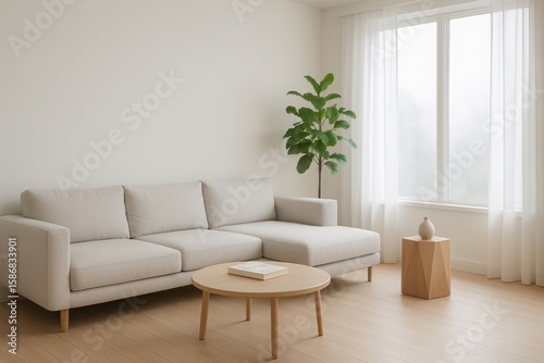 living, room, modern, minimalist, interior, design, sofa, sectional, couch, furniture, home, decor, contemporary, bright, roomy, natural, light, window, curtain, sheer, plant, houseplant, fiddle, leaf, fig, hot drink, table, round, side, vase, stylish, elegant, clean, neutral, colours, beige, white, wood, floor, hardwood, cosy, relaxation, comfort, scandinavian