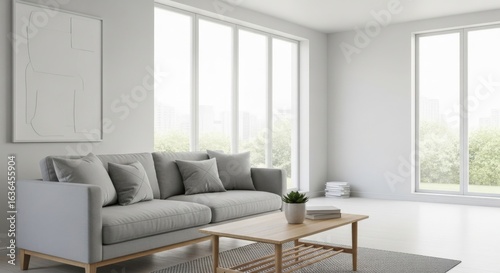 living, room, modern, minimalist, sofa, grey, couch, hot drink, table, window, light, interior, design, home, decor, furniture, empty, space, plant, neutral, simple, clean, contemporary, wooden, blank, art, frame
