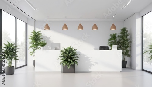 reception, office, minimalist, modern, interior, design, white, plant, clean, contemporary, decor, workspace, desk, building, architecture, aesthetic, style, room, space, bright, simple, elegant, light, window, sunlight, natural, professional, corporate, setting, minimal, lobby, area, waiting, floor, ceiling, lamp, pot, green, lighting, furniture