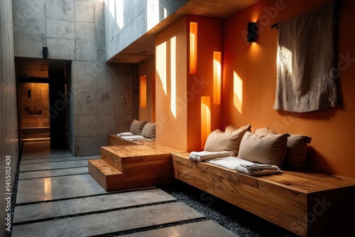 spa, interior, design, minimalist, relaxing, relaxation, seating, lighting, wood, contemporary, comfort, natural light, flooring, wellness, decor, architecture, elegance, peaceful, inviting, sanctuary, lounge, pillow, ceiling, skylight, texture, warm colors, cosy, calm, ambience, luxurious, well-being, calmness