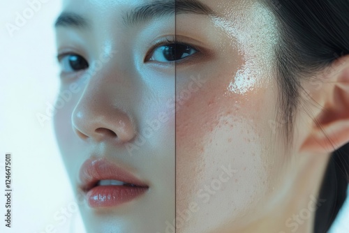 modern minimalist split-screen composition showing skin transformation, featuring soft lighting and close-up dermatological detail