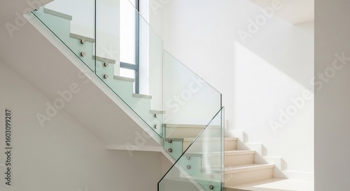 stair, staircase, glasses, railing, railing, modern, minimalist, interior, design, architecture, home, house, building, residential, contemporary, bright, light, beige, step, ascent, ascending, clean, simple, elegant, sleek, line, structure, indoor, hallway, room, space, white, wall, window, illumination, perspective, angle, geometric, pattern, construction, property, real estate, luxury, style, aesthetic, transparent, banister, balustrade