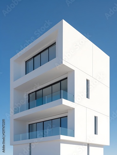 Modern minimalist white building with large glass windows and clean geometric design, featuring a bright blue sky backdrop, showcasing contemporary architecture and urban aesthetics