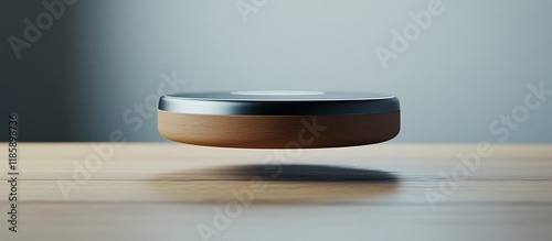 disc, wooden, metal, modern, minimalist, futuristic, design, concept, technology, innovation, object, round, circular, levitation, floating, surface, table, wood, brown, grey, silver, chrome, black, dark, light, smooth, clean, simple, elegant, aesthetic, geometric, shape, style, contemporary, product, device, contraption, engineering, industrial