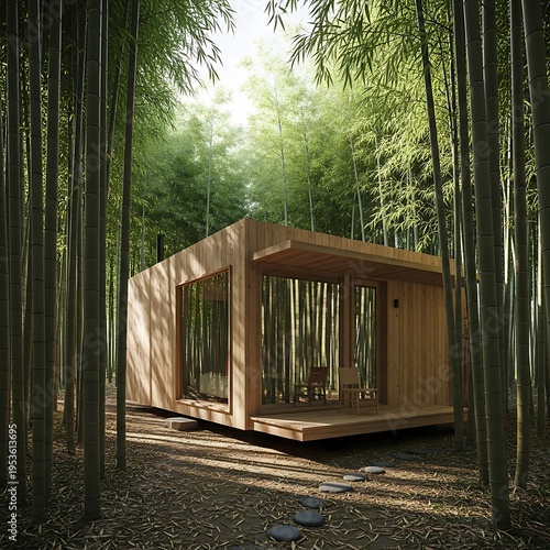 Modern minimalist wooden cabin with large windows nestled in a serene bamboo forest with dappled sunlight