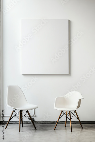 Modern minimalistic interior with two white chairs and blank canvas. Clean design with neutral tones perfect for home or office decor.