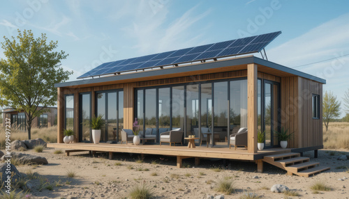Modern modular home unit featuring solar panels, surrounded by natural landscape, exuding sense of sustainability and comfort